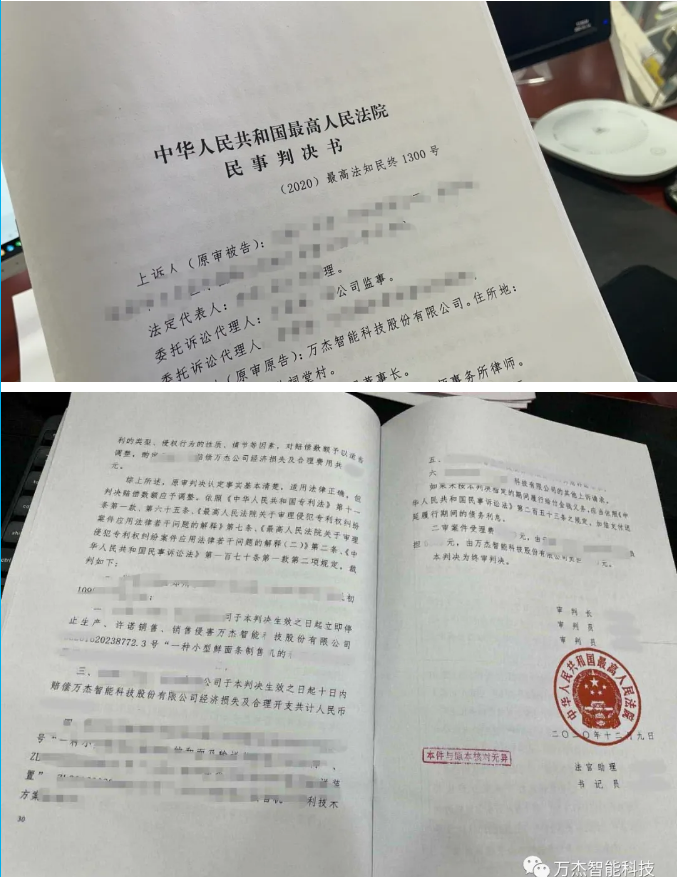 | 2020年12月9日,中華人民共和國(guó)最高人民法院下達(dá)“(2020)最高法知民終1300號(hào)”民事判決書,最終裁決的部分內(nèi)容如下(侵權(quán)公司用“北京某公司”來替代): 01 最終裁決的部分內(nèi)容 “北京某公司”于本判決生效之日起立即停止生產(chǎn)、許諾銷售、銷售侵害萬杰智能科技股份有限公司ZL201620238772.3號(hào)“一種小型鮮面條制售機(jī)的和面及輸送裝置混合器”專利的產(chǎn)品。 02 賠償 “北京某公司”于本判決生效之日起十日內(nèi)賠償萬杰智能科技股份有限公司經(jīng)濟(jì)損失及合理開支共計(jì)人民幣****萬元; 隨著最高人民法院的終審判決,萬杰智能關(guān)于智能鮮面機(jī)兩年多的維權(quán)之路終于塵埃落定。此次判決,對(duì)萬杰智能數(shù)十年來“以創(chuàng)新謀發(fā)展”的堅(jiān)持初心給予了莫大的鼓舞,也給目前使用萬杰智能鮮面機(jī)成千上萬的終端用戶以及城市合伙人注入了一針強(qiáng)心劑,更加激勵(lì)著萬杰智能在未來的日子里以更飽滿的熱情為社會(huì)大眾提供更好的產(chǎn)品和更貼心的服務(wù)! 每一個(gè)創(chuàng)新,是大量智慧和汗水凝聚而成的成果,不容竊取!