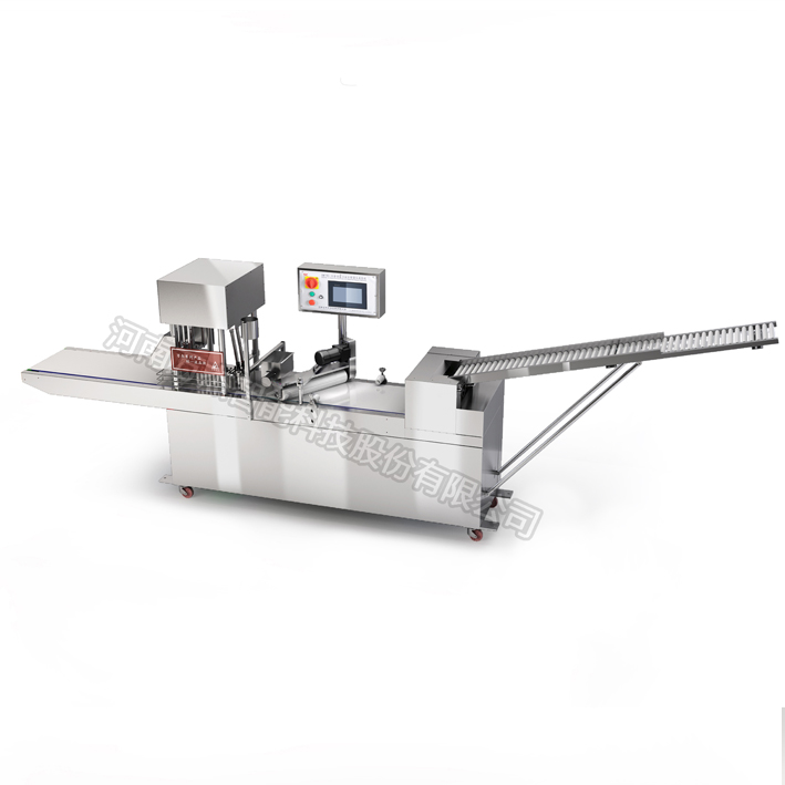 DMT90-Ⅲ觸摸屏微電腦控制方饅頭生產線是將面帶通過自動分割,整形機輸送,分割后送入主機二次壓片整形,卷成條胚,由刀切機構成形,制出成品,并使產品重量更加準確,有光澤,有筋度,保持純仿手工的工藝及口味,更加節省人力。